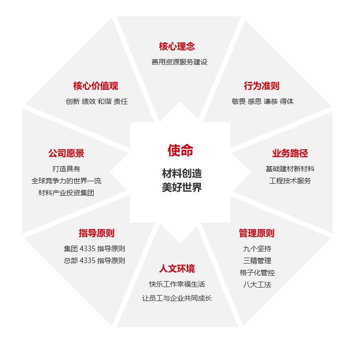 中國建材一路走來,創造了一部不忘初心、艱苦創業、拼搏奮斗的輝煌歷史。深厚的文化底蘊以及高度的國企責任,鑄就了中國建材集團獨具特色的文化體系。這套文化體系激勵著中國建材人一路攻堅克難、自立自強,為國家乃至全世界源源不斷地提供先進的產品和專業的服務,也讓我們從一家草根央企成長為全球最大的綜合性建材產業集團。