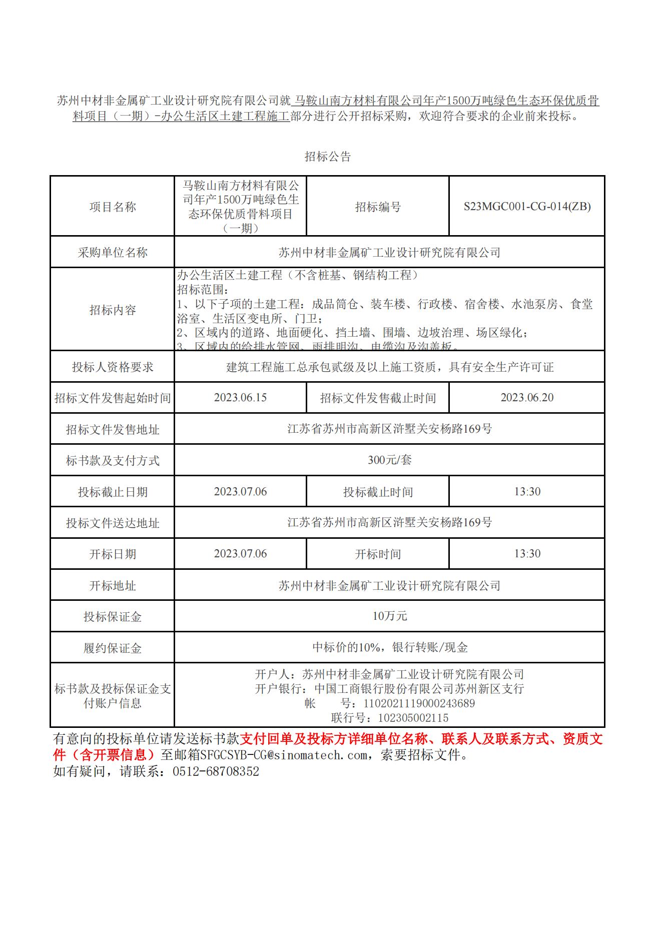 馬鞍山南方材料有限公司年產1500萬噸綠色生態環保優質骨料項目(一期)-辦公生活區土建工程施工招標公告