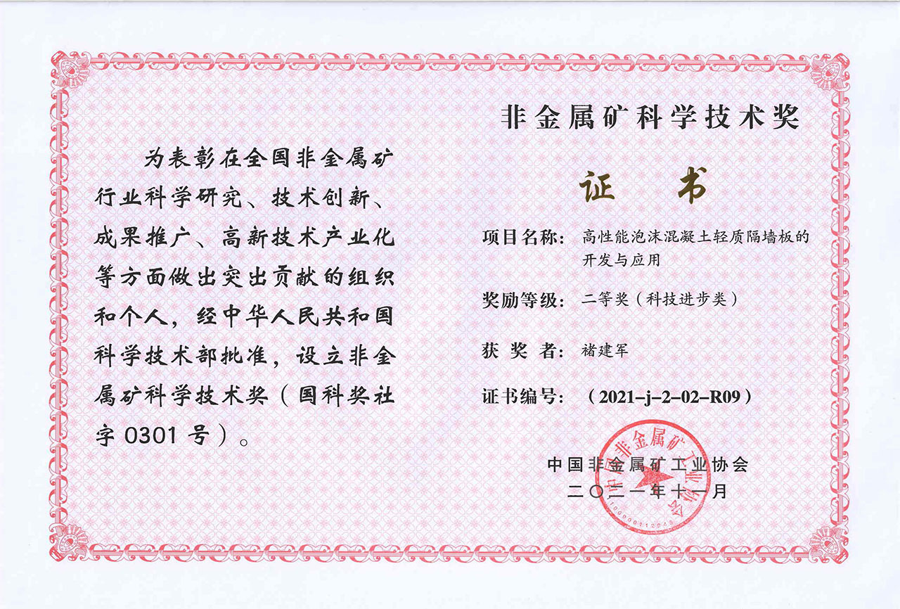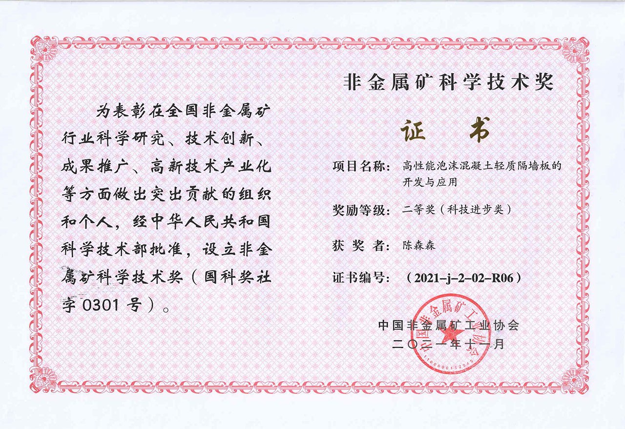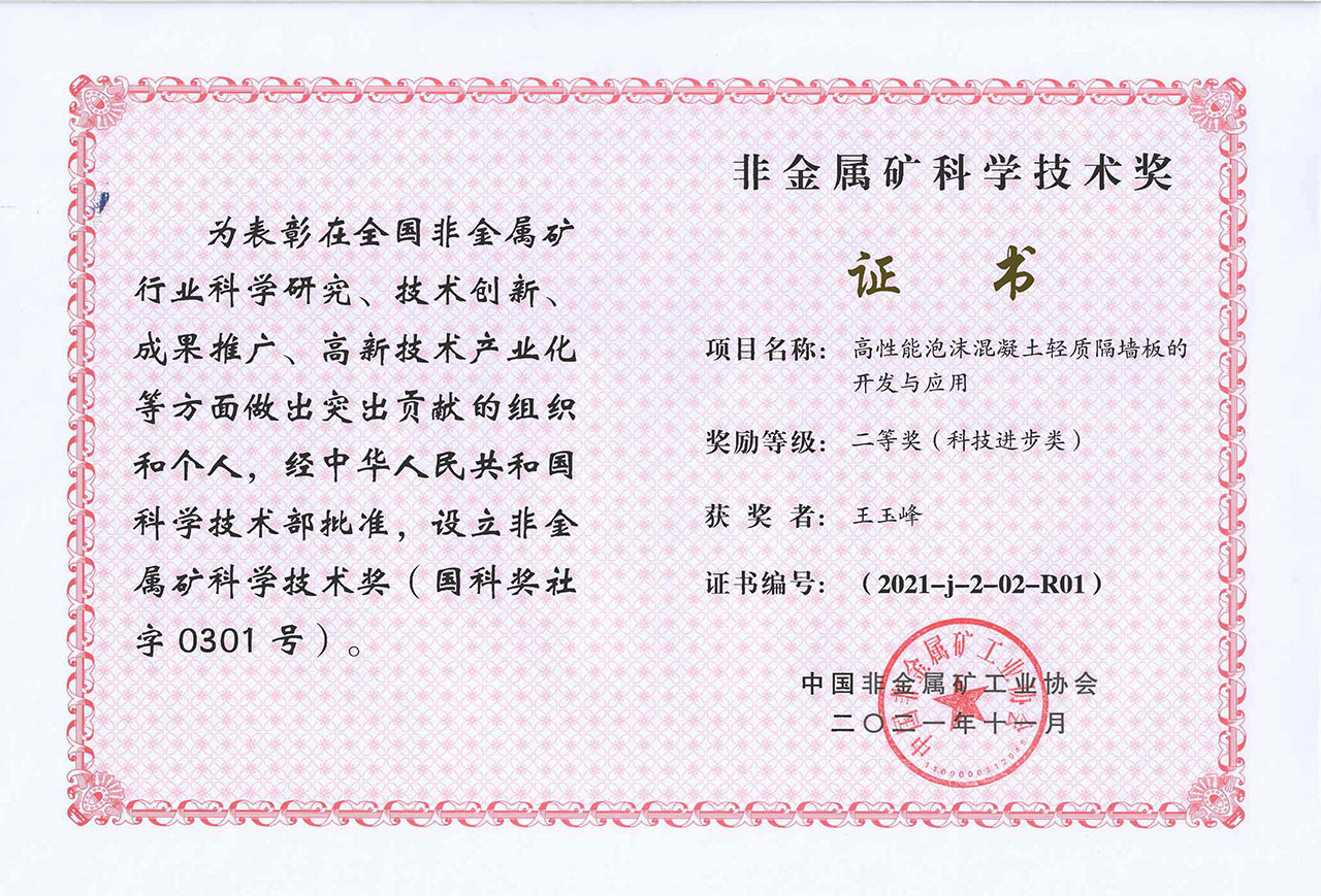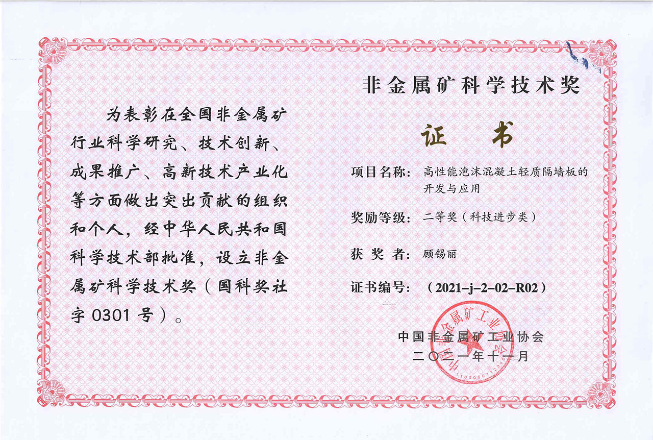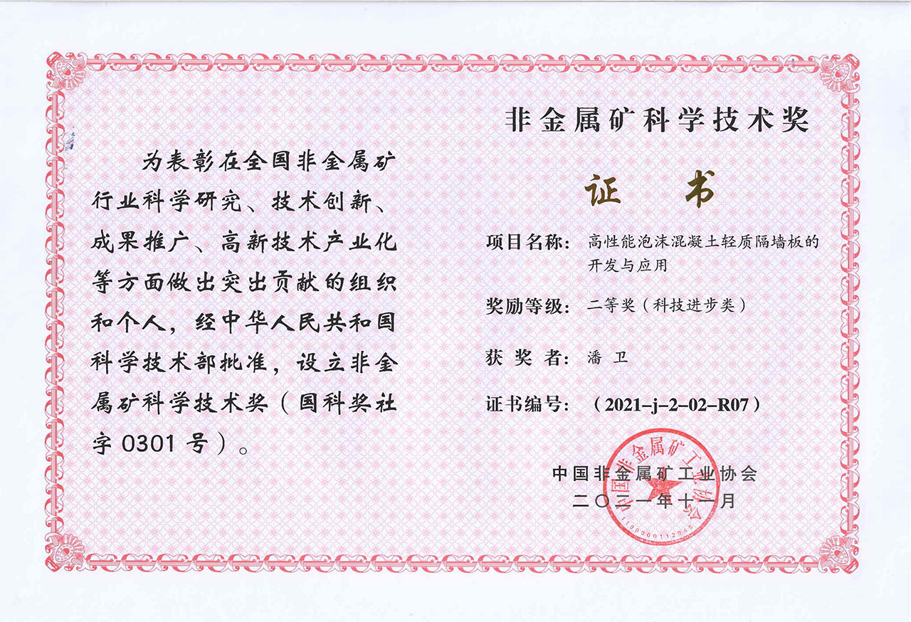 2021年-高性能泡沫混凝土輕質隔墻板的開發與應用-非金屬礦科學技術獎二等獎-中國非金屬礦工業協會